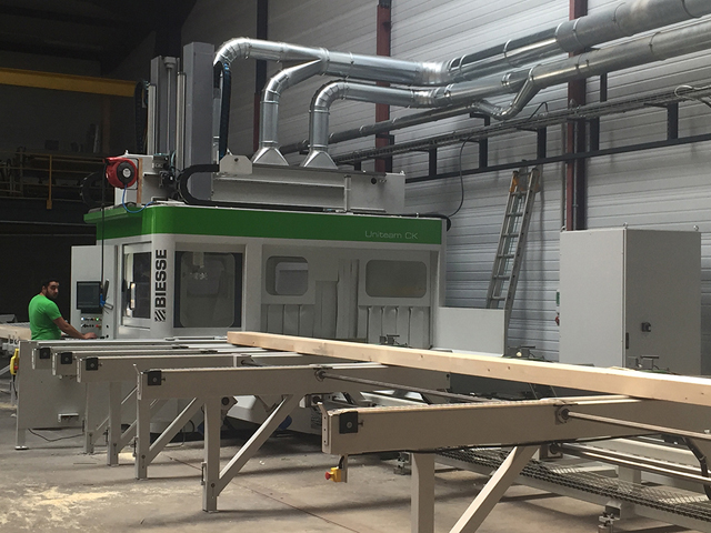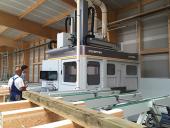 L'entreprise s'est spécialisée dans la fabrication de structures en bois et s'adresse principalement à des entreprises de charpente bois. L'agence DCI vient d'installer un centre d'usinage UNITEAM type ULTRA de 18 m de long, avec 3 têtes 5 axes pour l'usinage de pièces de charpente, de lamellé-collé et de panneaux massifs jusqu'à 3 m de large dans son nouvel atelier de production.