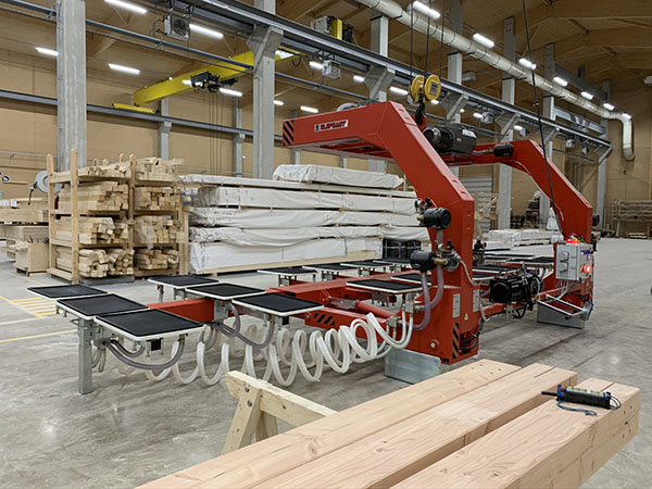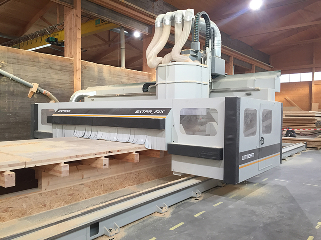 Elle usine aussi des panneaux CLT de grandes dimensions. L'Agence DCI lui a fourni un centre d'usinage UNITEAM type EXTRA-MIX de 38 m de long comprenant 2 postes de travail de 16 m pour la production de panneaux d'un haut niveau de qualité.